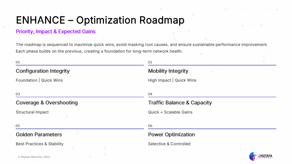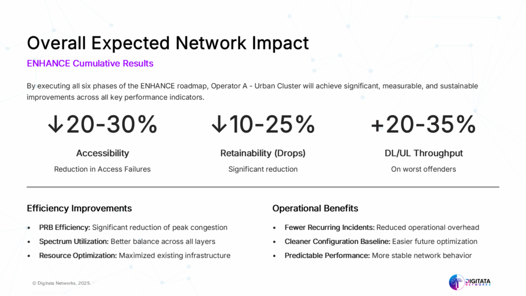 By translating Insight’s findings into an executable Enhance roadmap, we showcased immediate, quantifiable wins that the operator could immediately implement based on correlated CM/PM patterns and observed network behavior, not on generic assumptions or theorizing.